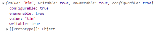 프로퍼티를 생성한 것만으로도 프로퍼티의 값(value), 값의 갱신 가능 여부(writable), 열거 가능 여부(enumerable), 재정의 가능 여부(configurable)에 대한 내용이 자동으로 정의되어 있는 것을 확인할 수 있다.