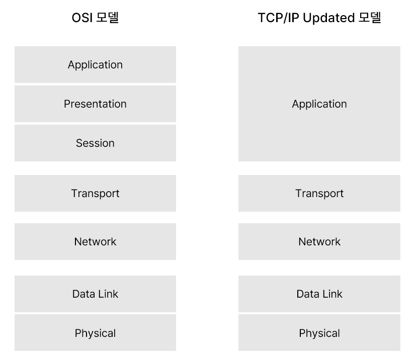 OSI 모델의 5, 6, 7단계를 하나의 단계로 묶는다면 TCP/IP Updated 모델과 같다. 따라서 OSI 모델을 이해한다면 현재 산업에서 많이 이용되는 TCP/IP Updated 모델 또한 이해할 수 있다. 위에서 설명했듯 물리 계층, 데이터 링크 계층, 네트워크 계층, 응용 계층 순으로 데이터의 송신, 수신이 일어나며, 우리가 흔히 사용하는 서버 - 클라이언트의 통신도 이와 같은 과정으로 이해할 수 있다.